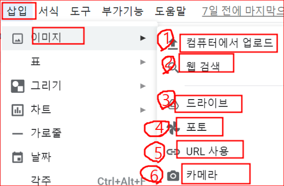 구글 Docs 열기 - 삽입 - 이미지 - 를 클릭하여 어디에서 이미지를 가져올지 선택하는 여섯 가지 방법이 있다.(아래 그림 참고)