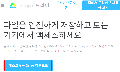 위 사이트에 접속하여 아래 그림처럼 화면이 나올 때 '데스크톱용 드라이브(Drive) 다운로드'를 누르면 파일이 자동으로 다운로드되며, 다운로드된 파일을 클릭하면 설치가 진행된다.