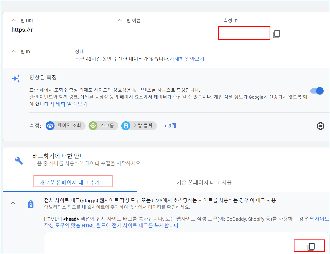 - 가입이 완료되면 아래와 같은 화면이 뜨는데 "새로운 온페이지 태그 추가"를 클릭하여 아래 그림 우측 하단 붉은 박스 속의 복사 아이콘을 눌러 복사한다.