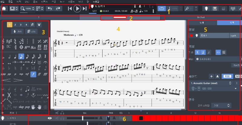 기타 프로 메인 화면의 패널은 다음과 같이 나누어진다.