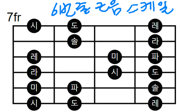 6번 줄 근음은 기타 5가지 스케일 중 '시, 도, 레'모양 스케일에서 자동으로 만들어지는 코드이다.