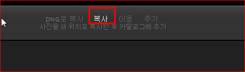 화면 왼쪽에서 사진을 가져올 카메라 메모리 카드를 선택한 후, 썸네일 위의 창 상단에서 복사를 클릭한다.