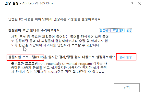 그리고 불필요한 프로그램(pup, Potentially Unwanted Program) 검사를 하는 방법도 있다.