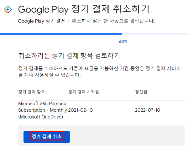 구글 플레이 '정기 결제 결제 취소' 버튼을 클릭한다.