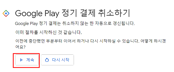 아래 그림과 같이 구글 플레이 정기 결제 취소하기 페이지에서 - '계속'을 누른다