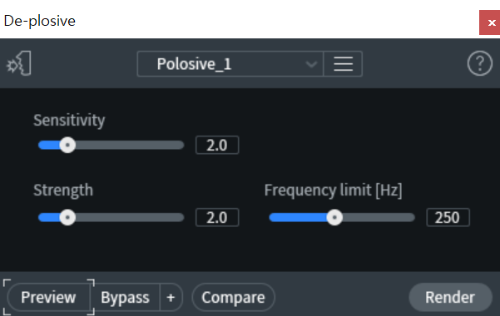 - plosive를 감소시키면서 음성 신호를 유지하기 위해 감도 제어를 높이고 강도 제어를 낮춘다.(Higher values can result in significant plosive reduction at the cost of decreasing the quality and clarity of the speech signal. To maintain the speech signal while still reducing plosives, try increasing the Sensitivity control and decreasing the Strength control)