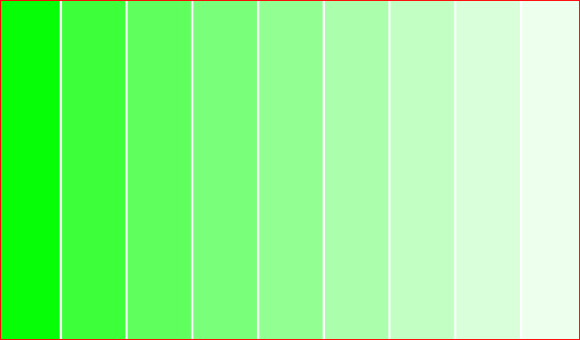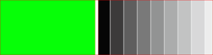 위 녹색 RGB(255,0,0)과 회색 단계별 레이어를 합성했을 때 50% 밝기 영역을 기준으로 이보다 밝은 영역은 단색 그대로 보이고 더 어두운 영역은 어둡게 보이는 결과가 나타난다.
