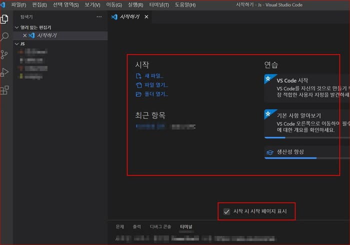 아래 화면은 시작 시 열린다. 안 열리면 아래 그림의 '시작시 시작페이지 표시'에 체크하면 시작시 아래 화면이 뜬다. 이 화면을 이용하여 새 파일, 최근 항목 등 빠른 실행이 가능하다.