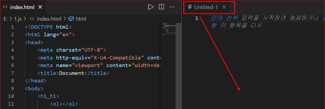 저장하고 나면 우측 하단의 문서 표시가 html로 나타나는 것이 보인다. 즉 비주얼 스튜디오 코드가 이 파일을 html이라는 언어로 인식했다는 것을 의미한다.