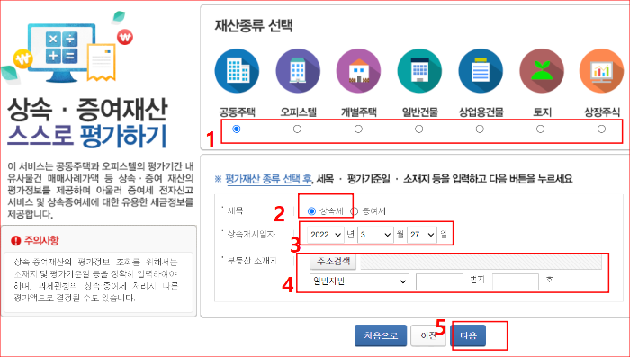 - 등록 시가가 없는 경우 소재지, 면적 등을 입력하면 보충적 평가액이 자동계산