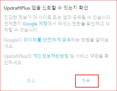 UpdraftPlus - 를 신뢰할 수 있는지 확인 후 신뢰할 수 있으면 '허용'을 클릭한다.