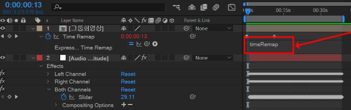 영상에 마우스 우클릭한 후 - Time - Enable Time Remapping을 클릭한다.