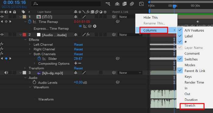 메뉴 Animation - keyframe Assistant - Convert Audio to keyframe의 순서로 오디오 키프레임을 변환한다.