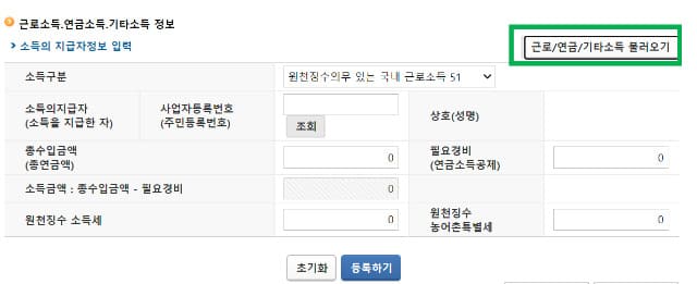 '근로/연금/기타 소득 불러오기'를 누른다.