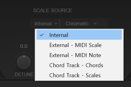 - Pitch Scale Source는 Internal, External, Chord Track 중에서 선택할 수 있으며, 아래 그림과 같이 5가지입니다