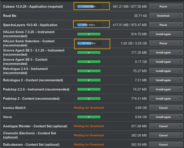 그러면 아래 그림처럼 install 화면이 나오는데, 맨 위의 Install All을 눌러 전체를 설치해도 되지만, 큐베이스 12 버전을 사용하고 있는 경우라면 필요한 아래 그림 중 녹색을 제외한 나머지 부분만 다운로드해도 됩니다.