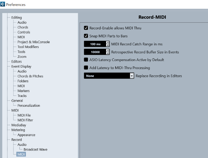 - Retrospective Record Buffer Size in Events : 이 기능은 큐베이스가 실행 중일 때 연주한 MIDI 이벤트를 기억하는 버퍼의 크기를 설정합니다. 버퍼 기능이란 입력 데이터를 큐베이스의 가상 메모리에 기억했다가 필요한 경우 연주한 내용을 나중에 불러올 수 있는 기능입니다. 데이터 기록 중 데이터가 손실될 경우 유용할 수 있습니다.