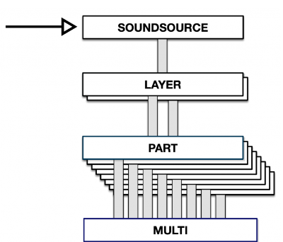 Trilian의 신호 경로는 사운드 소스에서 시작하므로 사운드 설정은 다른 모든 구성 요소에 영향을 미칩니다 - Trilian에서 사운드 소스는 자체 필터, 엔벌로프, 효과 등을 포함하는 레이어에 존재합니다.