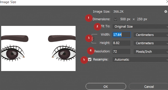 - ① Dimentions: 이미지 치수 : 가로 × 세로 (픽셀)