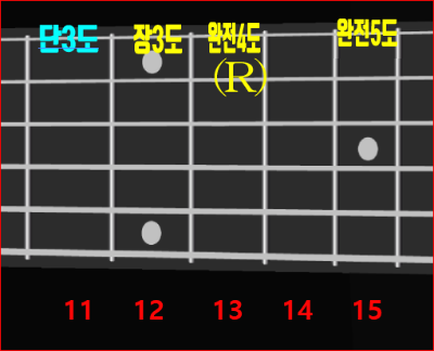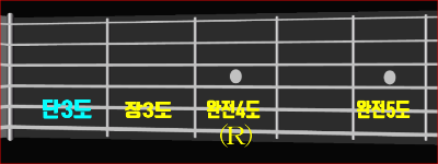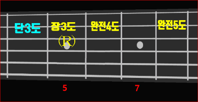 위의 지판의 경우 '근음'은 '도'이고 '완전 4도'는 '파', '완전 5도'는 '솔'이다.