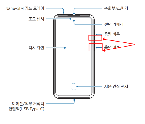 다음 그림을 참고하여 측면 버튼과 음량(아래로) 버튼을 동시에 누르면 됩니다.