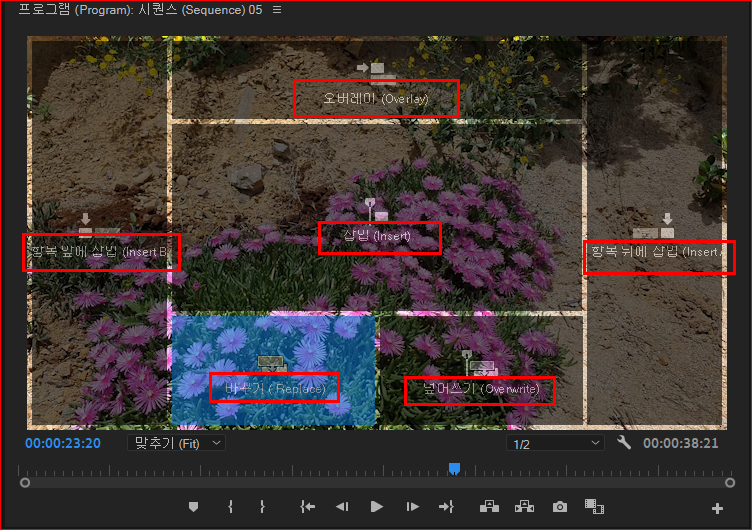소스 영상을 프로그램 창으로 드래그 - 6가지 옵션