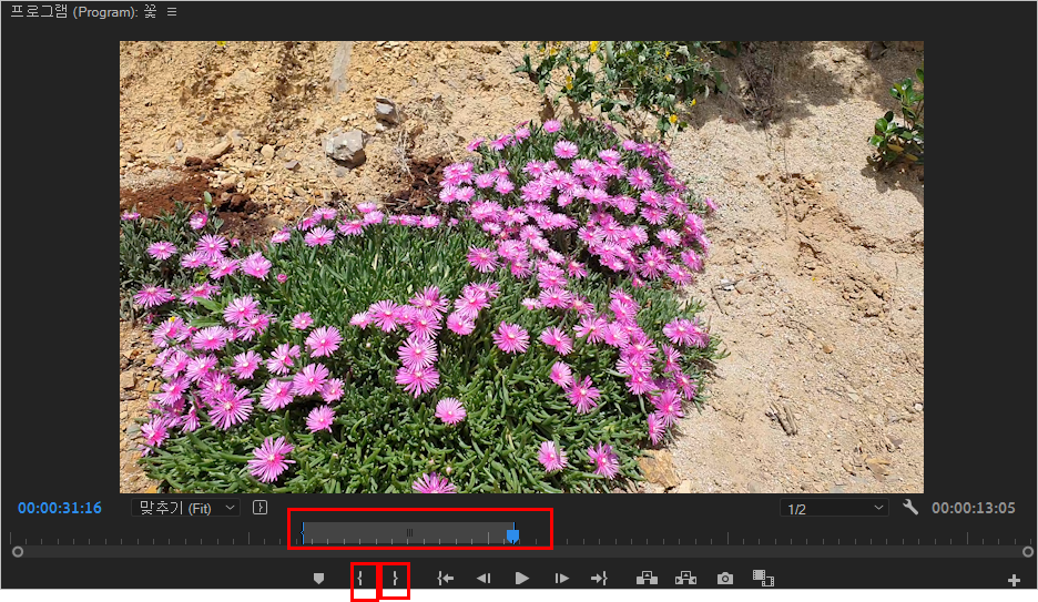 구간 지정=위의 플레이 헤드로 이동한 후 시작 표시 마크인, 종료 표시 마크 아웃