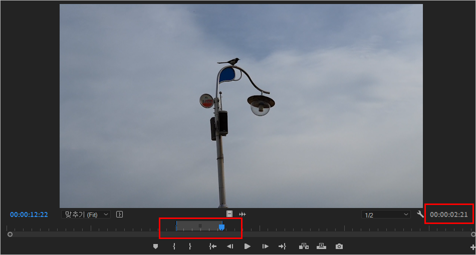 4) 구간 선택: 시작 표시 및 종료 표시 버튼 클릭으로 시퀀스에 추가할 소스의 특정 부분을 선택할 수 있다.