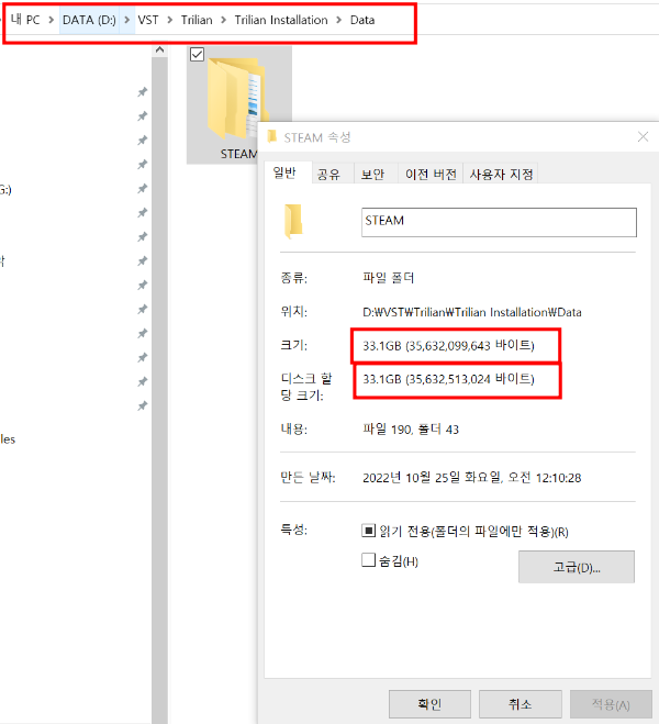 아래 그림은 TRILIAN, Spectrasonics STEAM 폴더가 C드라이브에 위치한 내용이다