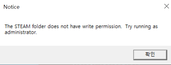 그러면 다음과 같이 '해당 폴더가 쓰기 권한이 없으므로, 관리자 권한으로 실행하라'는 문구가 나온다