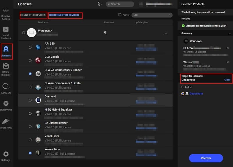Waves 플러그인 라이선스 Deactivate, Recover, Target for Licenses